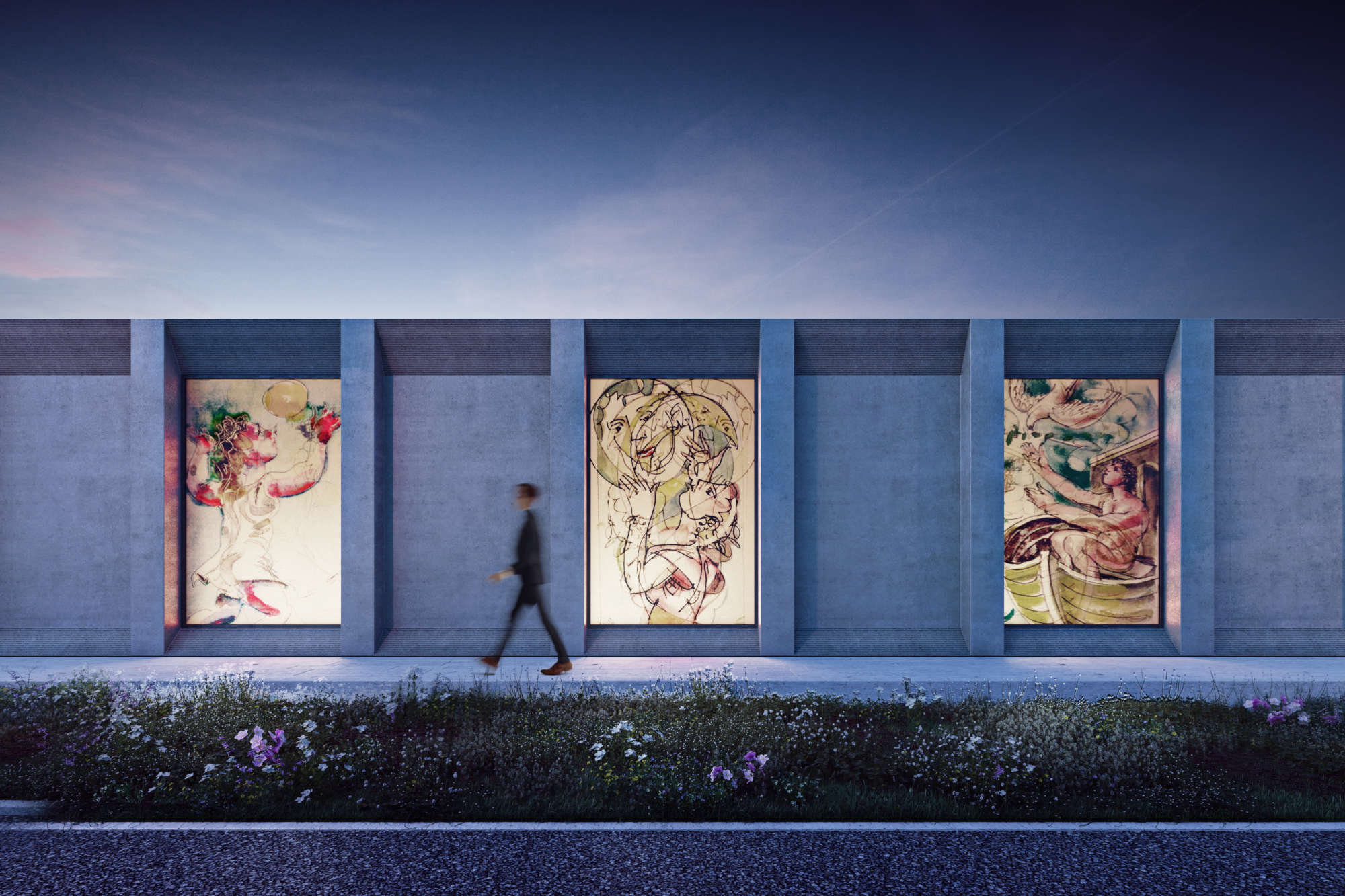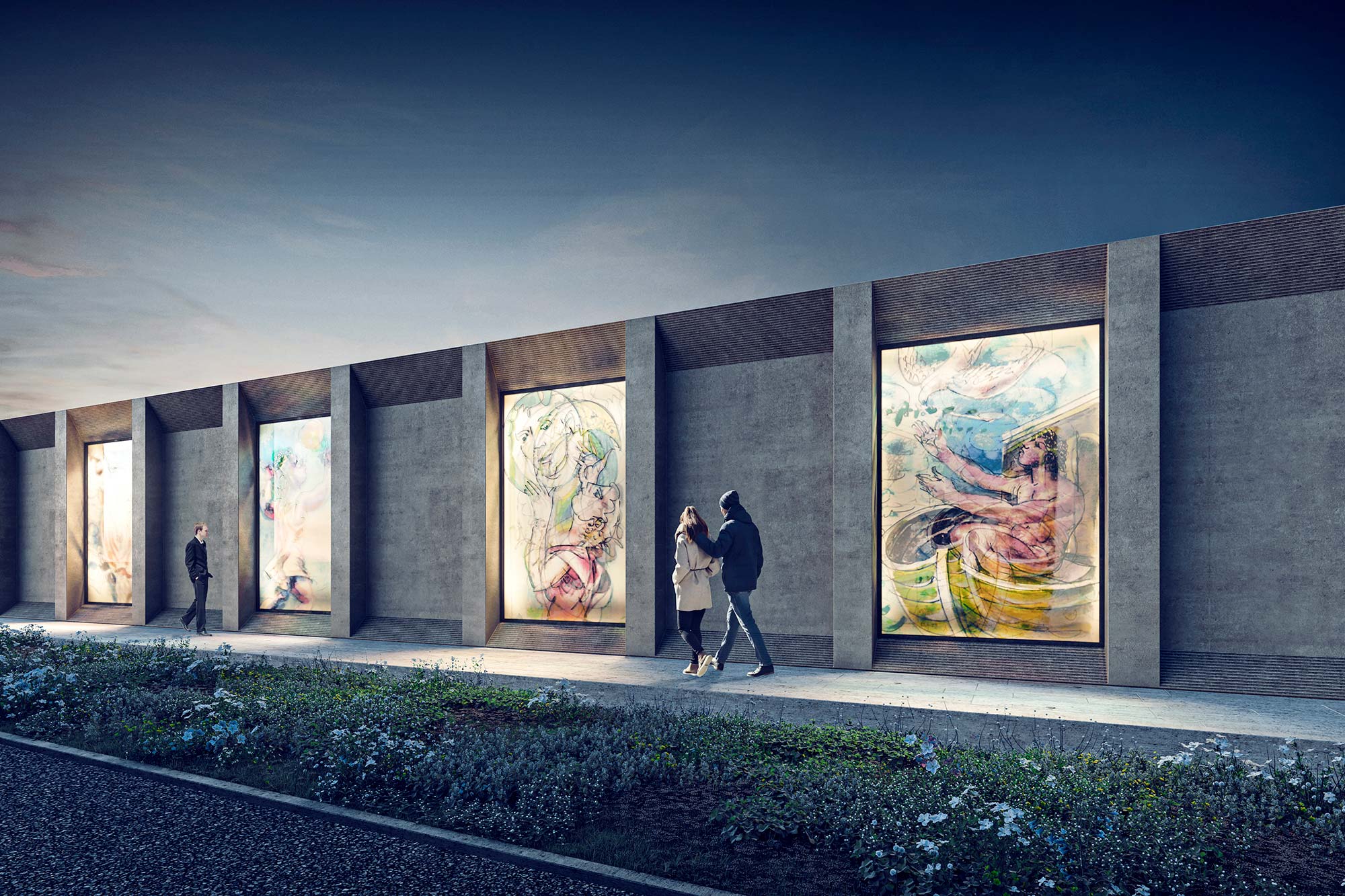 On entre dans le bâtiment par un couvert, qui laisse entrevoir un espace fermé, agrémenté d'un plan d’eau. En poursuivant à l’intérieur, on arrive dans un espace d’accueil, avant de se rendre dans le grand hall distribuant les chambres funéraires. Le hall des chambres offre un prolongement sur un patio extérieur . Celui-ci jouit pleinement du plan d'eau, une présence tant physique qu'émotionnelle. L'eau reflète la beauté d'un mur coffré, orné d’une grande fresque qui pourra être incrustée dans le béton ou imprimée sur de la céramique. Réunis, ces deux espaces constituent le cœur du projet : un lieu de recueillement et de retrouvailles pour les familles et les proches des défunts.