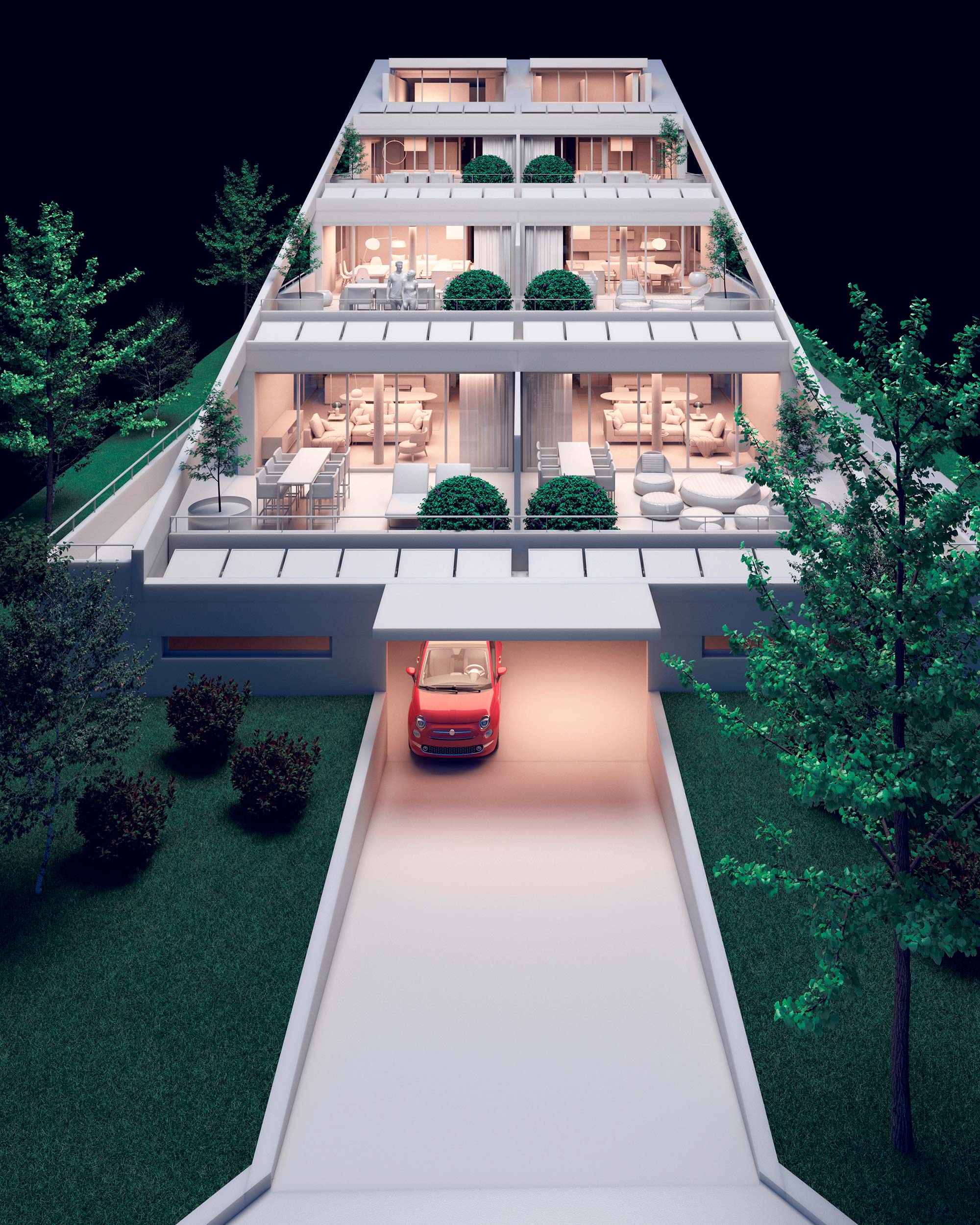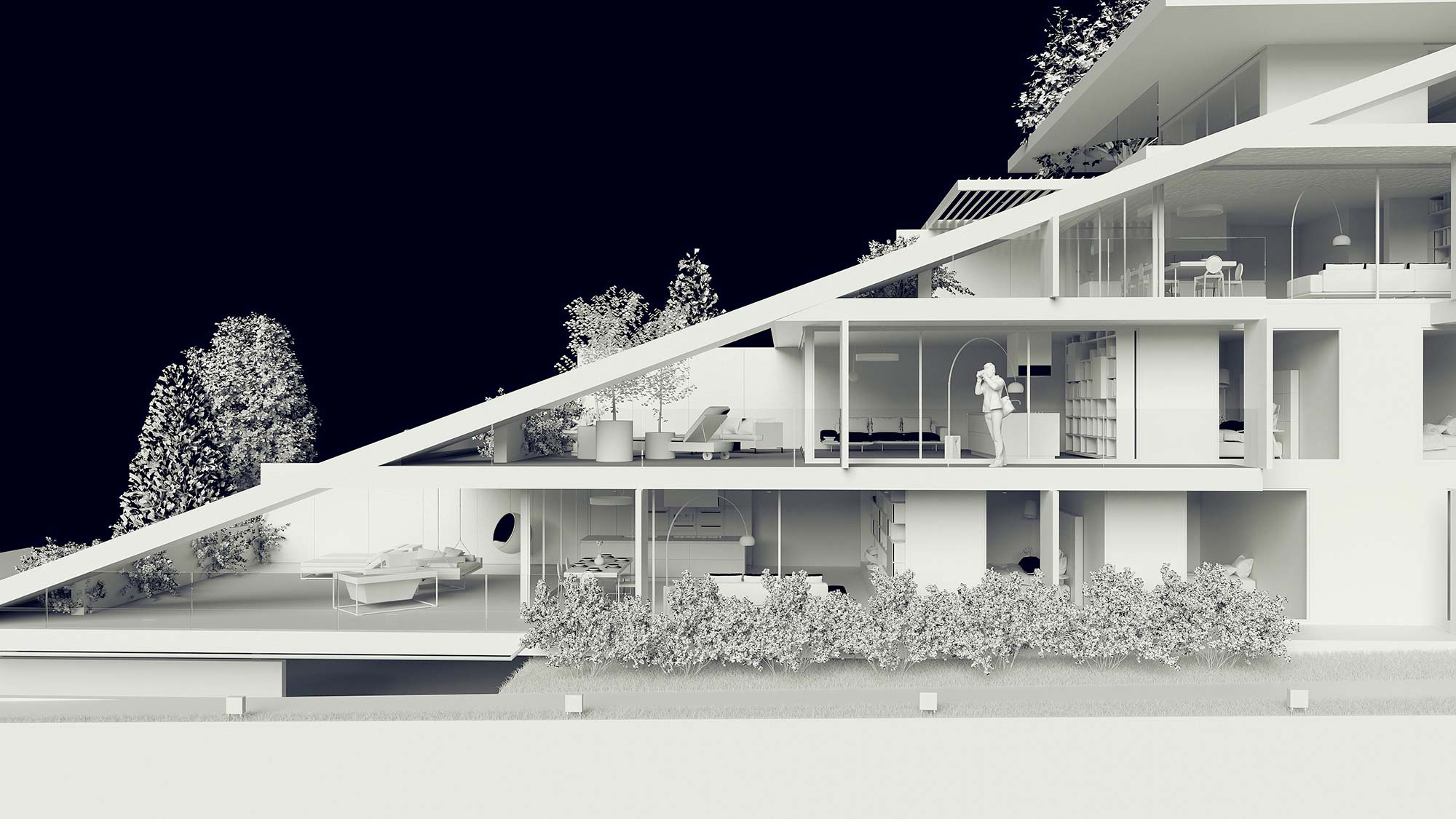Pour cet ensemble résidentiel situé sur la rue de Vétroz proche de toute les commodités et de l’école de Plan-Conthey, le projet s’implante sur une parcelle longiligne. L’idée a alors été de jouer avec les dimensions atypiques et les contraintes du terrain pour en maximiser le potentiel.