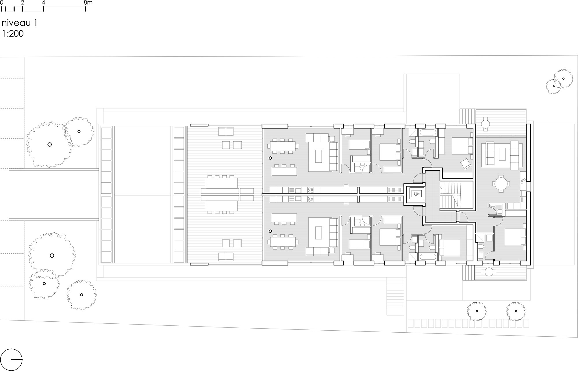 Nous avons alors conçu des appartements en gradins. Disposant de très belles terrasses de 45 m2, la plupart des 8 appartements bénéficient d’une exposition optimale, plein sud. La ligne droite dominante, les volumes juxtaposés sous un gabarit de toit à pans, s’intègre naturellement au quartier.