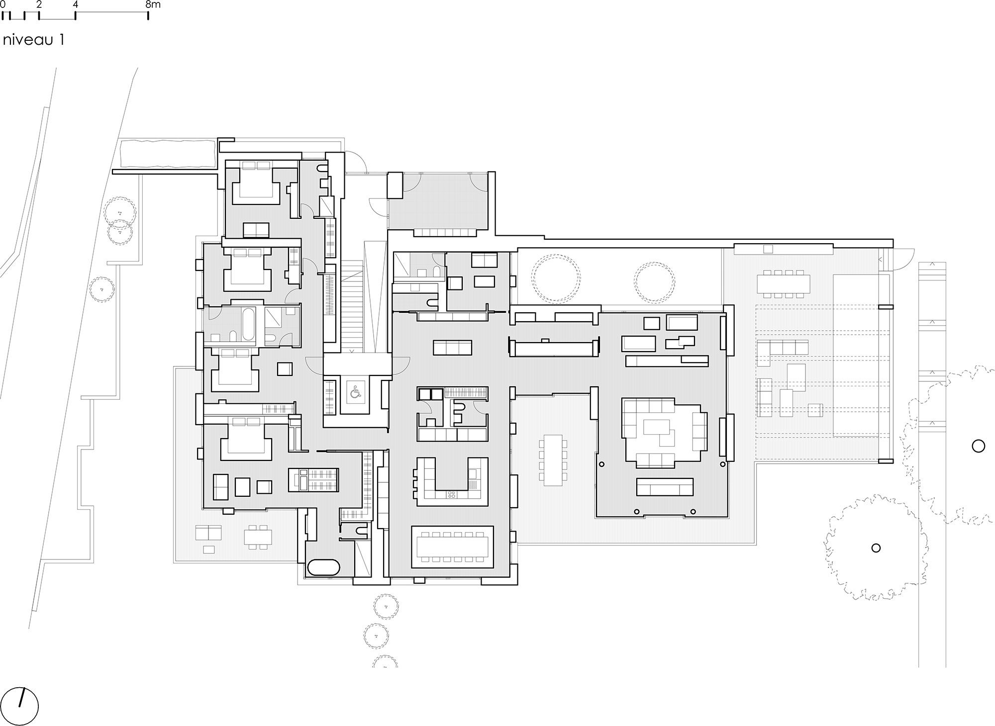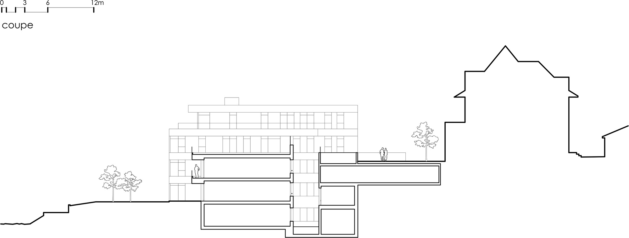 Sur le haut de la parcelle, la maison de maître existante, construite en 1914 et classée monument historique, a été préservée et l’intérieur e été entièrement réaménagé. Cette imposante bâtisse de 600 m2 sur 3 étages, avec une hauteur de plafond de 3 m 20, a été transformée par une association sportive.